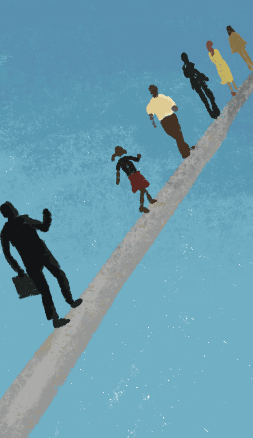 A human figure walks vertically into the sky, symbolizing ambition, progress, and upward drive.