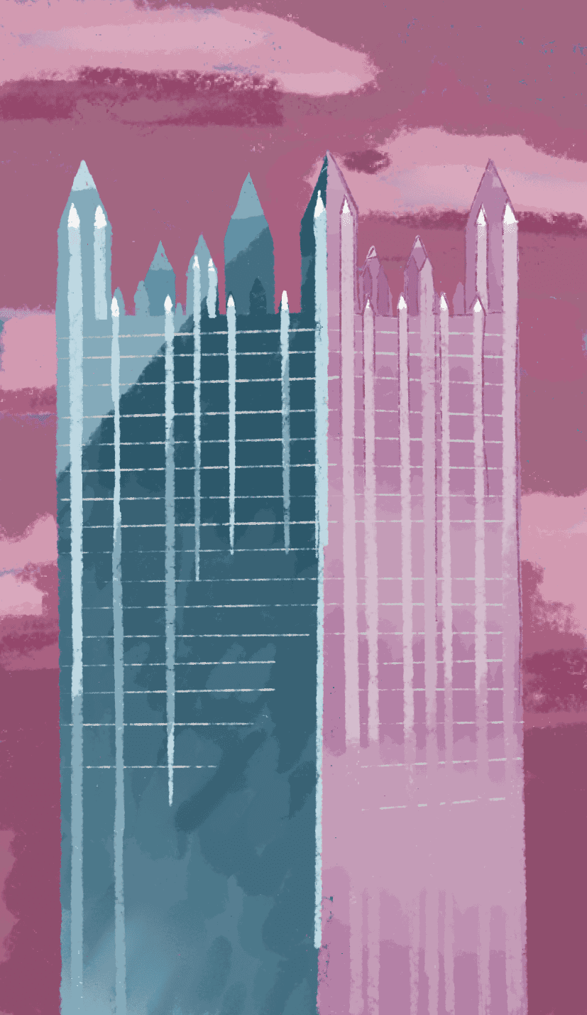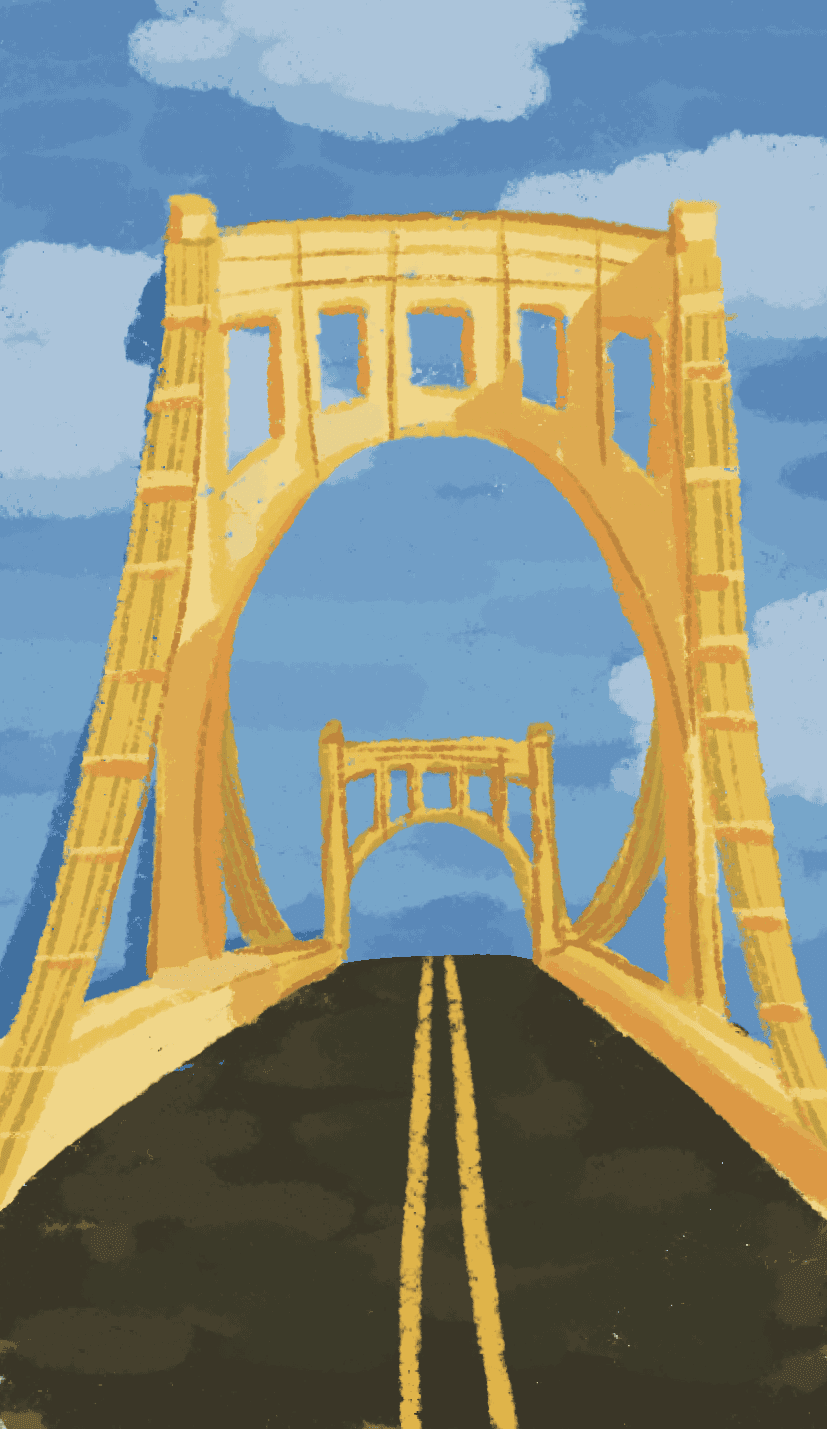 It captures the moment when the Pittsburgh skyline suddenly unfolds as you exit the Fort Pitt Tunnel.