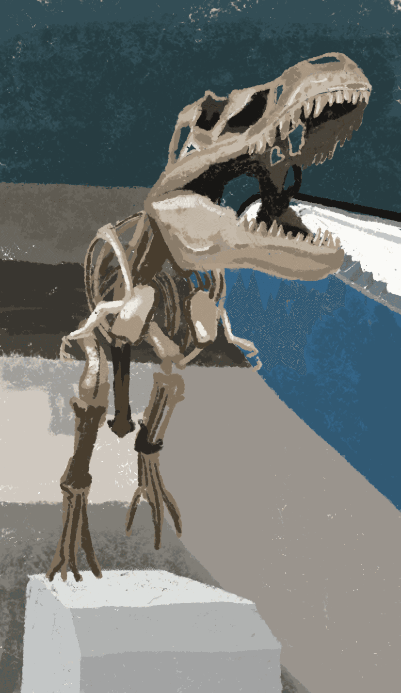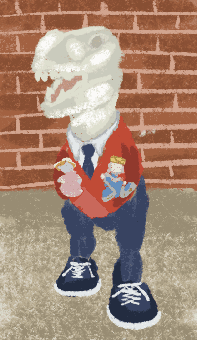 This sculpture combines the signature red cardigan of Fred Rogers with a dinosaur.