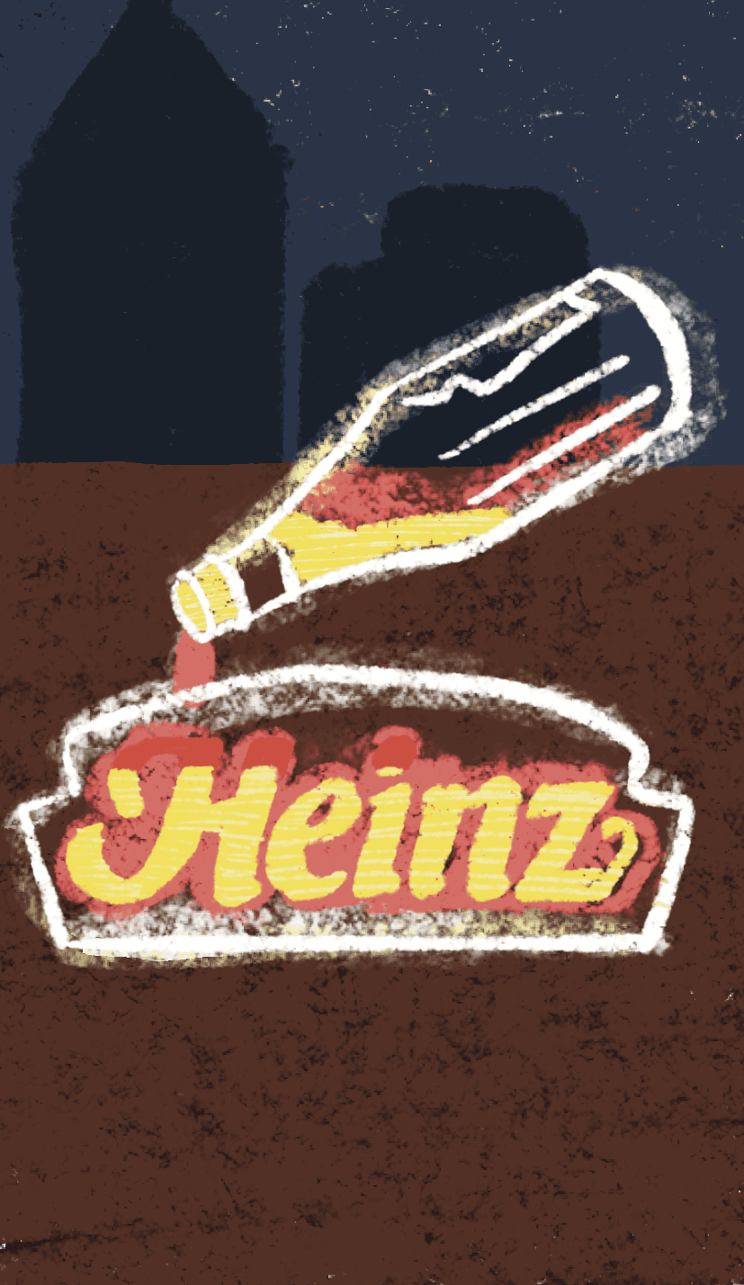 A giant glowing ketchup bottle that lights up Pittsburgh at night.